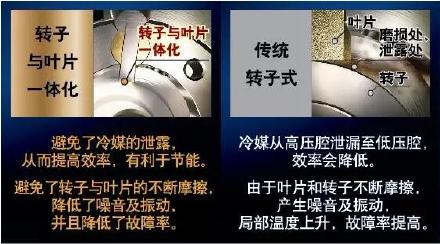 從上面的動態圖可以看出,轉子式壓縮機的轉子和葉片是分離的,那么在長期的運轉下,就容易反復摩擦,不但容易產生噪音,甚至會造成部件磨損和冷媒泄露等問題,可能提升空調的故障率。