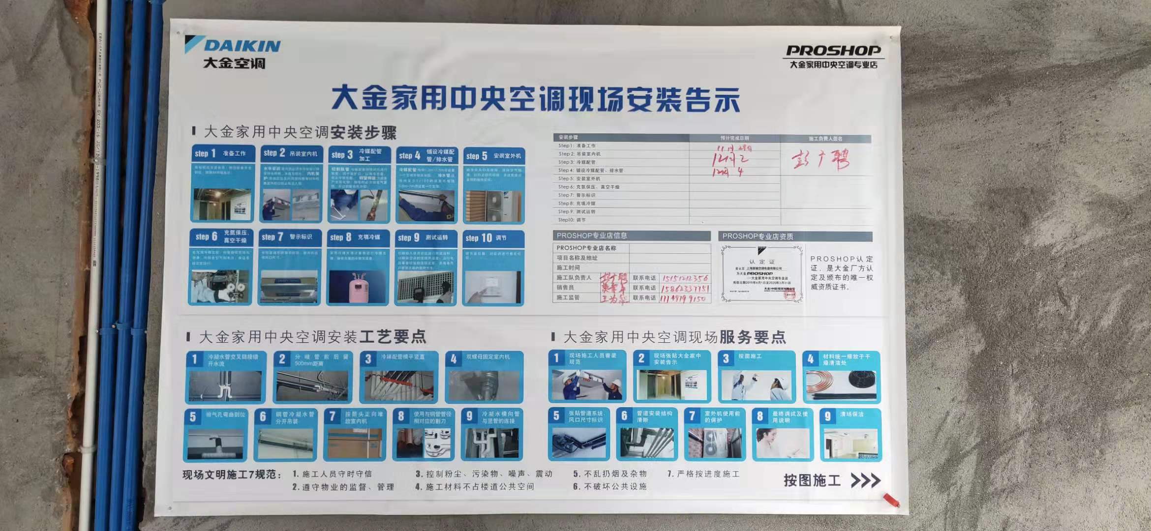 送貨進(jìn)場,中央空調(diào)機(jī)器要靠邊擺放整齊,正規(guī)施工人員都需要穿統(tǒng)一的工作服進(jìn)場施工,并在屋內(nèi)懸掛“公示牌”:能清楚的知道業(yè)主家負(fù)責(zé)安裝人員,責(zé)任到人;正規(guī)的施工會(huì)給業(yè)主一個(gè)保障,由一個(gè)團(tuán)隊(duì)負(fù)責(zé)一家施工,全部完工后再做另外一家的活動(dòng),不會(huì)為了多做活而趕工期。